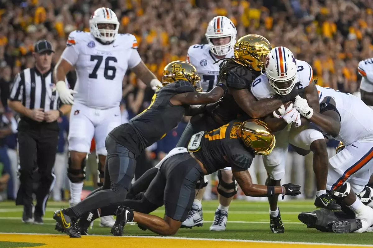 Auburn running back Damari Alston, right, pushes against Baylor defenders to score a touchdown run during the first half of an NCAA college football game Friday, Aug. 29, 2025, in Waco, Texas. (AP Photo/Julio Cortez)