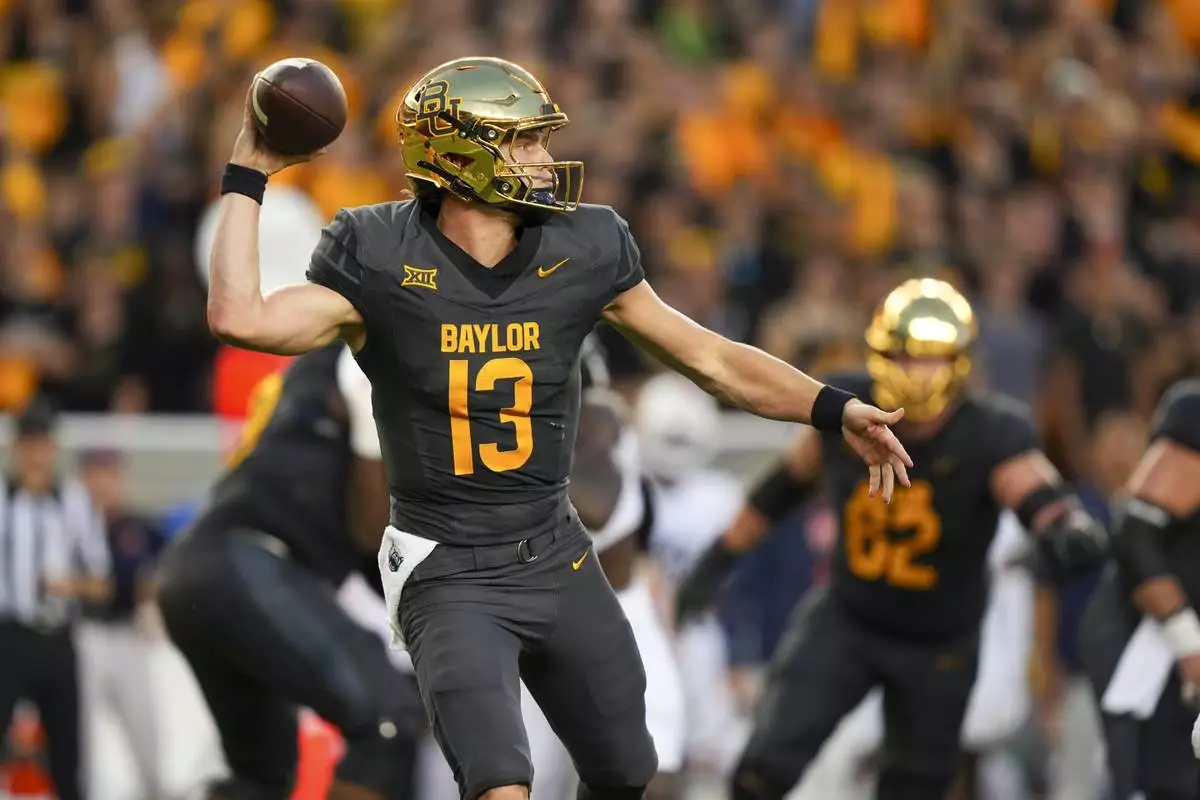 Baylor quarterback Sawyer Robertson throws a pass against Auburn during the first half of an NCAA college football game Friday, Aug. 29, 2025, in Waco, Texas. (AP Photo/Julio Cortez)