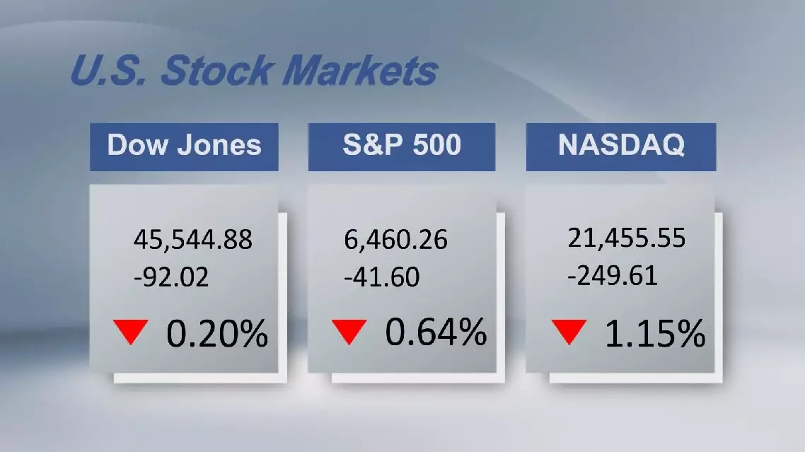 The Dow Jones Industrial Average dropped 92.02 points, or 0.2 percent, to 45,544.88. The S and P 500 declined 41.6 points, or 0.64 percent, to 6,460.26. The Nasdaq Composite Index fell 249.61 points, or 1.15 percent, to 21,455.55.
