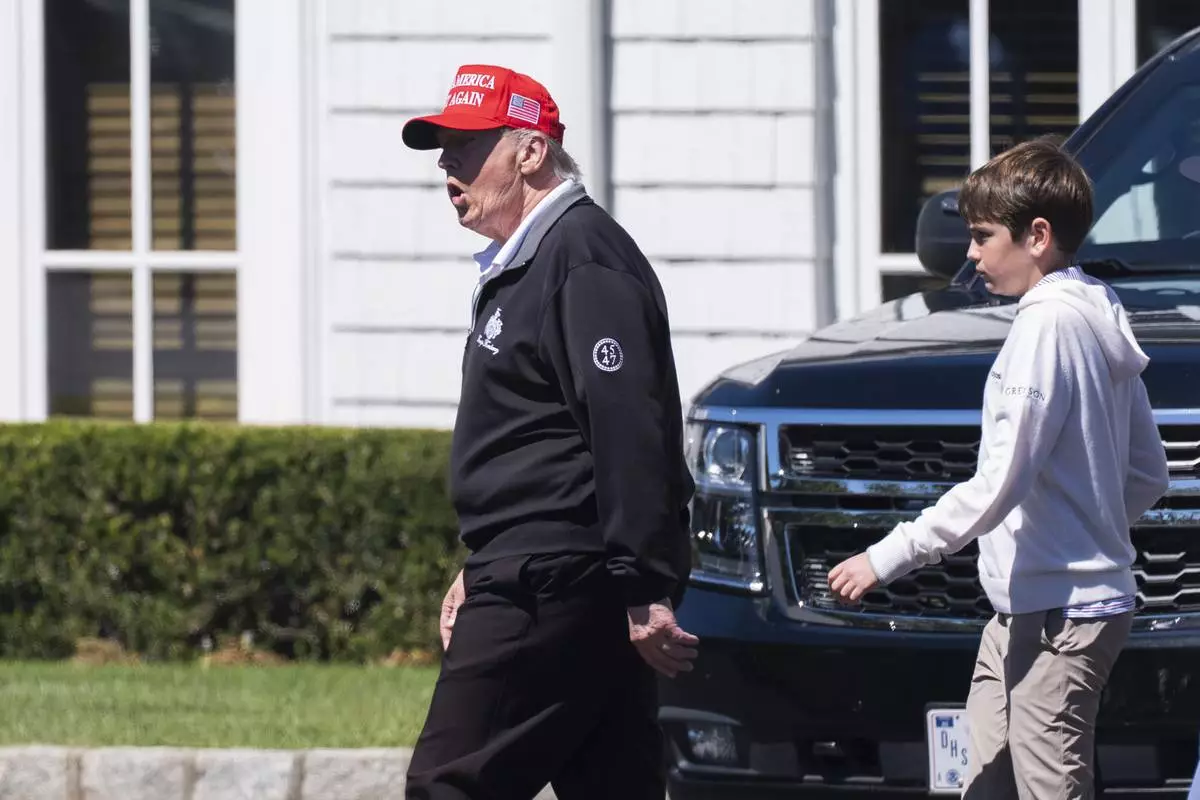 President Donald Trump, left, walks with his grandson Spencer Trump at the Trump National Golf Club in Sterling, Va., Saturday, Aug. 30, 2025. (AP Photo/Manuel Balce Ceneta)