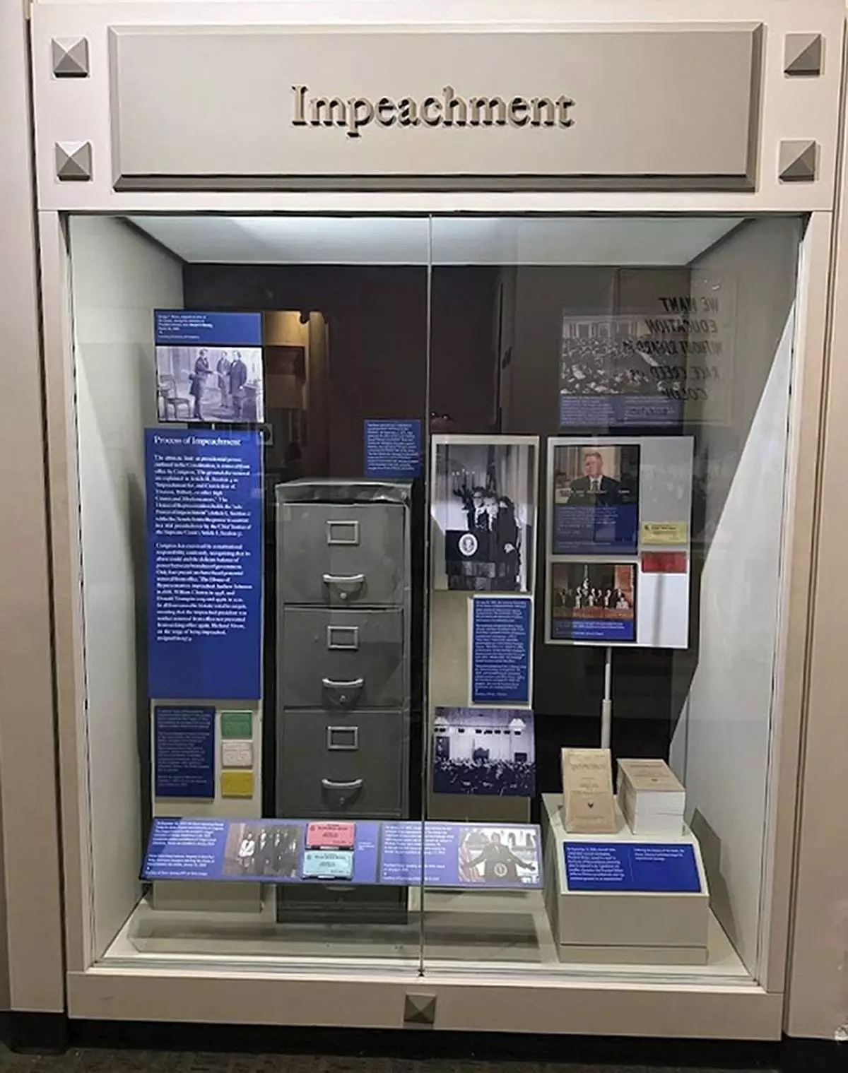 “On December 18, 2019, the House impeached Donald Trump for abuse of power and obstruction of Congress,” one label now states. “On January 13, 2021, Donald Trump became the first president to be impeached twice," says another. "The charge was incitement of insurrection based on his challenge of the 2020 election results and on his speech on January 6.” His Senate acquittals are duly noted.