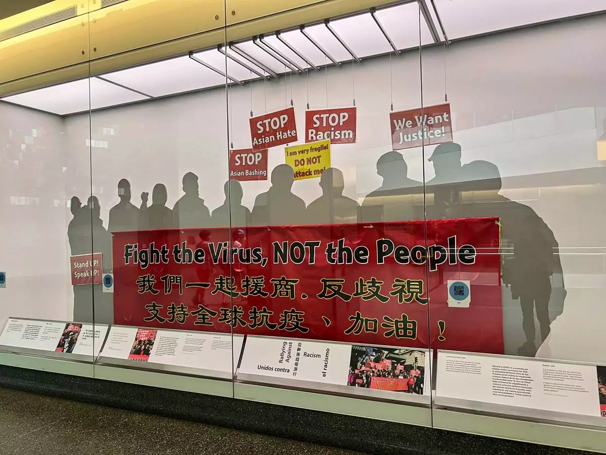 A “Fight the Virus, Not the People” COVID-19 banner at the Smithsonian’s National Museum of American History on Aug. 13, 2025. The banner was carried by counter-protesters at an anti-Asian hate march in San Francisco in February 2020. It is the museum’s most recent collection related to the pandemic. (AP Photo/River Zhang)