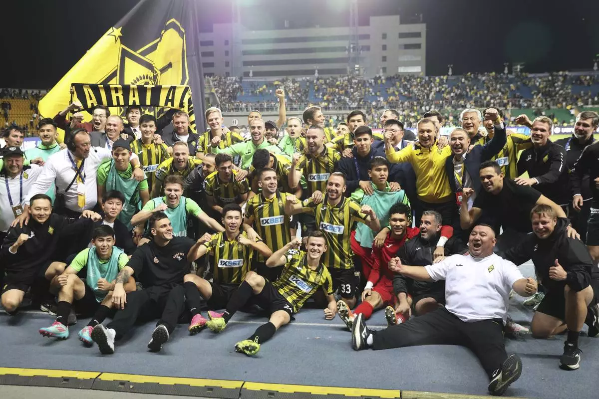 Kairat players celebrate after winning the Champions League playoff second leg soccer match between Kairat and Celtic at Ortalyk stadium in Almaty, Kazakhstan, Wednesday, Aug. 27, 2025. (AP Photo/Alikhan Sariyev)