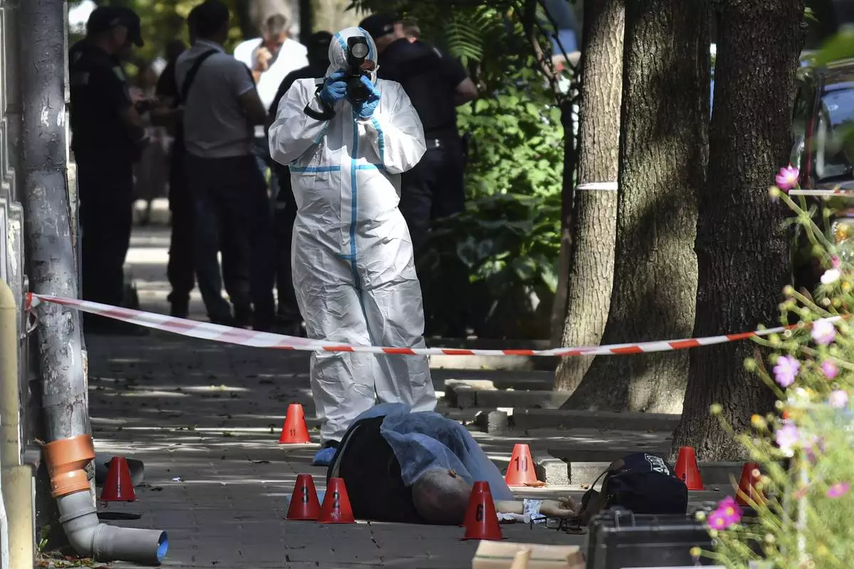 A forensic expert photographs a body of a former Ukrainian parliament speaker Andriy Parubiy, in Lviv, Ukraine, Saturday, Aug. 30, 2025. (AP Photo/Mykola Tys)