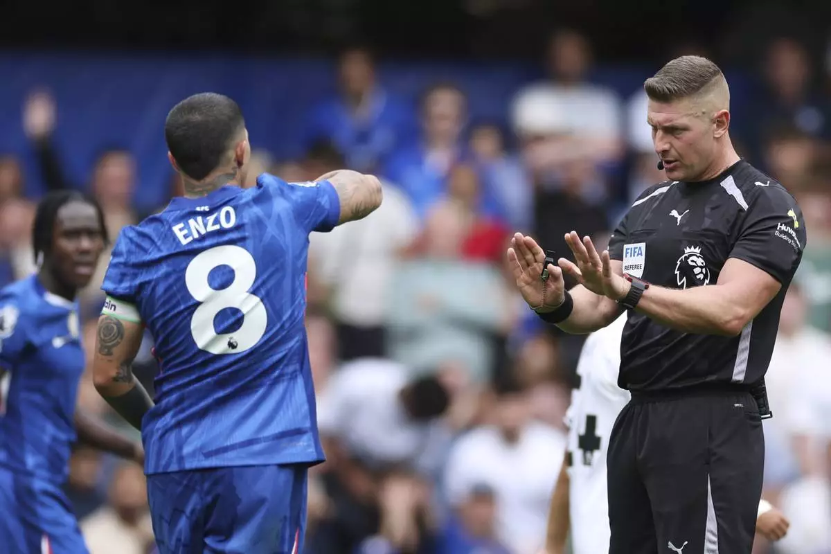 Referee Robert Jones, right, speaks with Chelsea's Enzo Fernandez during the English Premier League soccer match between Chelsea and Fulham at Stamford Bridge stadium in London, Saturday, Aug 30, 2025. (AP Photo/Ian Walton)