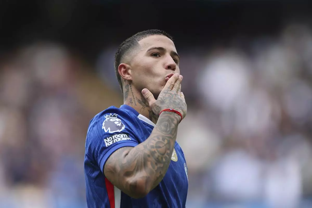 Chelsea's Enzo Fernandez celebrates after scoring his side's second goal during the English Premier League soccer match between Chelsea and Fulham at Stamford Bridge stadium in London, Saturday, Aug 30, 2025. (AP Photo/Ian Walton)