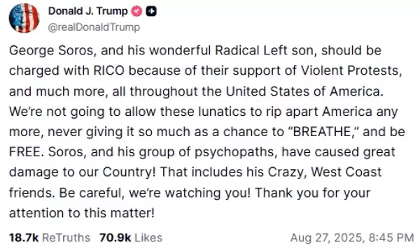 On August 27, Trump fired off a post on Truth Social claiming he wants to indict both Soros and son for funding these nationwide protests. His messaging was classic Trump takedown style: “George Soros, and his wonderful Radical Left son, should be charged with RICO because of their support of Violent Protests, and much more, all throughout the United States of America.” He didn’t stop there, warning Soros’s “Crazy, West Coast friends” that “we’re watching you!”
