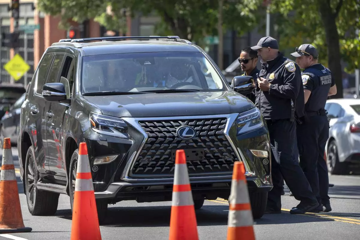 Metropolitan Police Department officers talk to a driver at a checkpoint operated by the Metropolitan Police Department and federal agencies, including officers from Immigration and Customs Enforcement (ICE) and Homeland Security Investigations (HSI), on Georgia Avenue in the northern part of Washington, Saturday, Aug. 30, 2025. (AP Photo/Mark Schiefelbein)