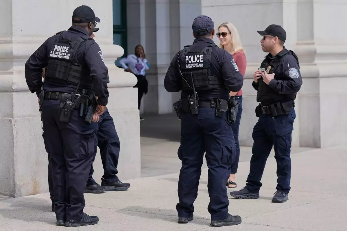 Members of the U.S. Customs and Border Protection Police patrol Union Station, Thursday, Aug. 28, 2025, in Washington. (AP Photo/Mariam Zuhaib)