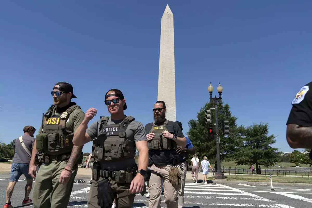 Homeland Security Investigations (HSI) agents patrol the National Mall, Saturday, Aug. 23, 2025, in Washington. (AP Photo/Jose Luis Magana)