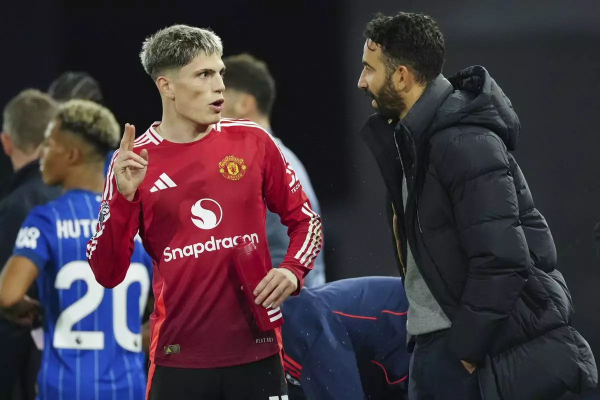 FILE - Manchester United's head coach Ruben Amorim, right, talks with Alejandro Garnacho during the English Premier League soccer match between Ipswich Town and Manchester United at Portman Road stadium in Ipswich, England, Sunday, Nov. 24, 2024. (AP Photo/Dave Shopland, File)