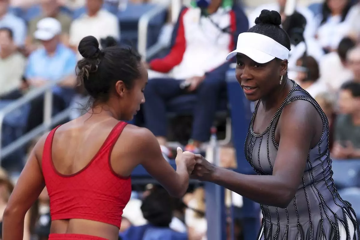 Venus Williams, of the United States, and Leylah Fernandez, of Canada, celebrate during their doubles match during the third round of the U.S. Open tennis championships, Saturday, Aug. 30, 2025, in New York. (AP Photo/Heather Khalifa)