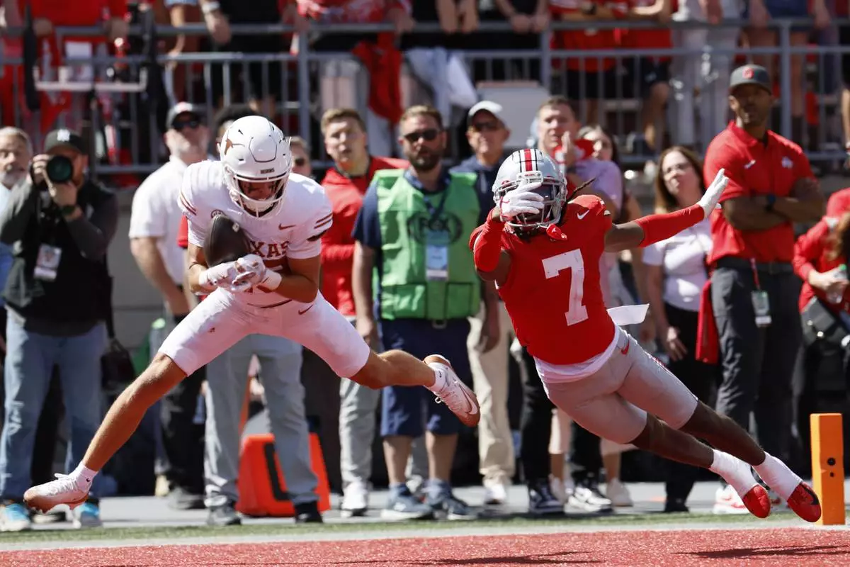 Texas receiver Parker Livingstone, left, catches a touchdown pass in front of Ohio State defensive back Jermaine Mathews during the second half of an NCAA college football game, Saturday, Aug. 30, 2025, in Columbus, Ohio. (AP Photo/Jay LaPrete)