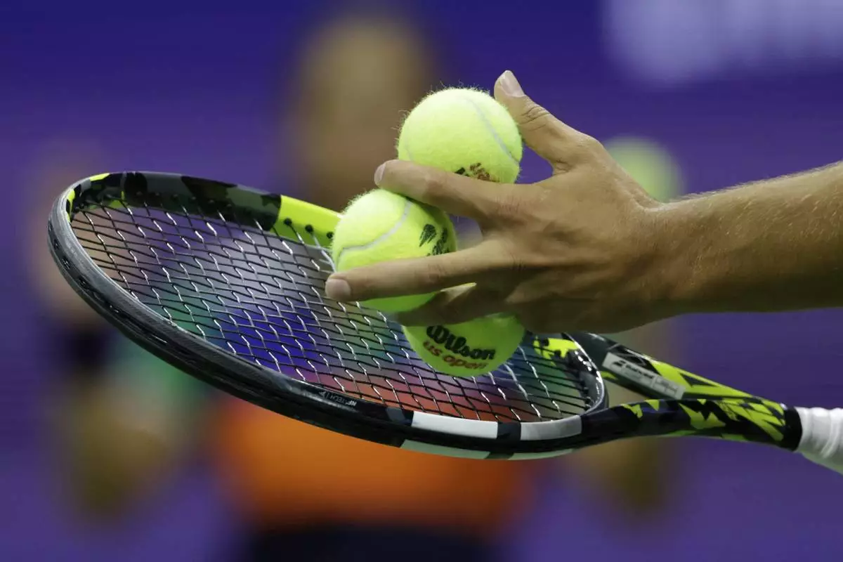 Carlos Alcaraz, of Spain, holds onto tennis balls against Reilly Opelka, of the United States, during the first round of the U.S. Open tennis championships, Monday, Aug. 25, 2025, in New York. (AP Photo/Adam Hunger)
