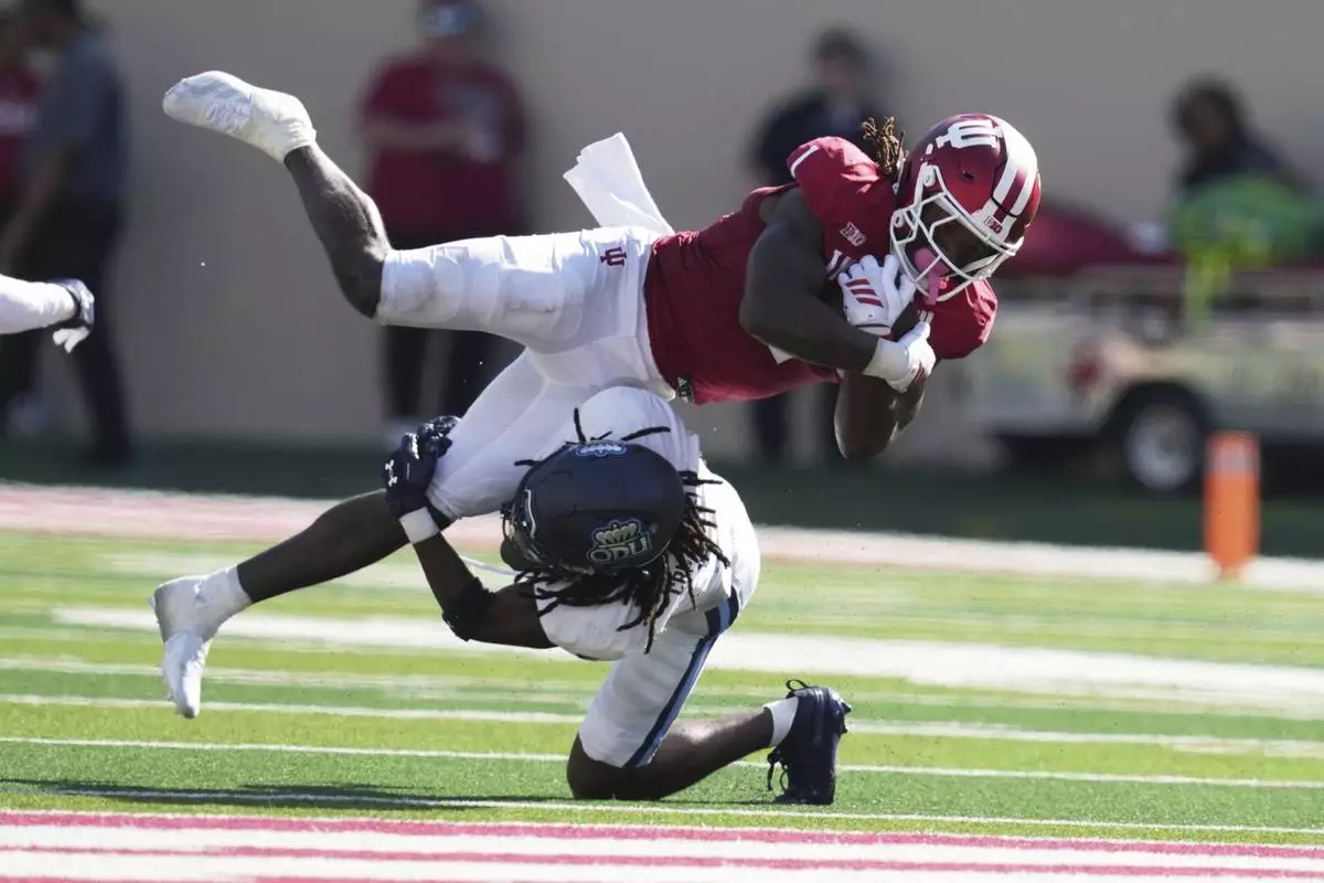 Indiana running back Roman Hemby (1) is tackled by Old Dominion cornerback Brandon Crutchfield (5) during the second half of an NCAA college football game, Saturday, Aug. 30, 2025, in Bloomington, Ind. (AP Photo/Darron Cummings)