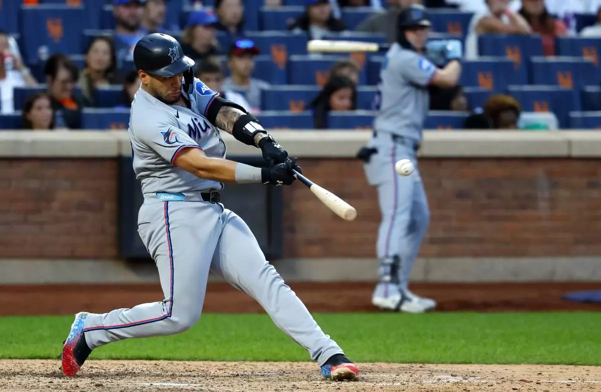 Miami Marlins' Agustín Ramírez hits double during the ninth inning of a baseball game against the New York Mets, Saturday, Aug. 30, 2025, in New York. (AP Photo/Noah K. Murray)