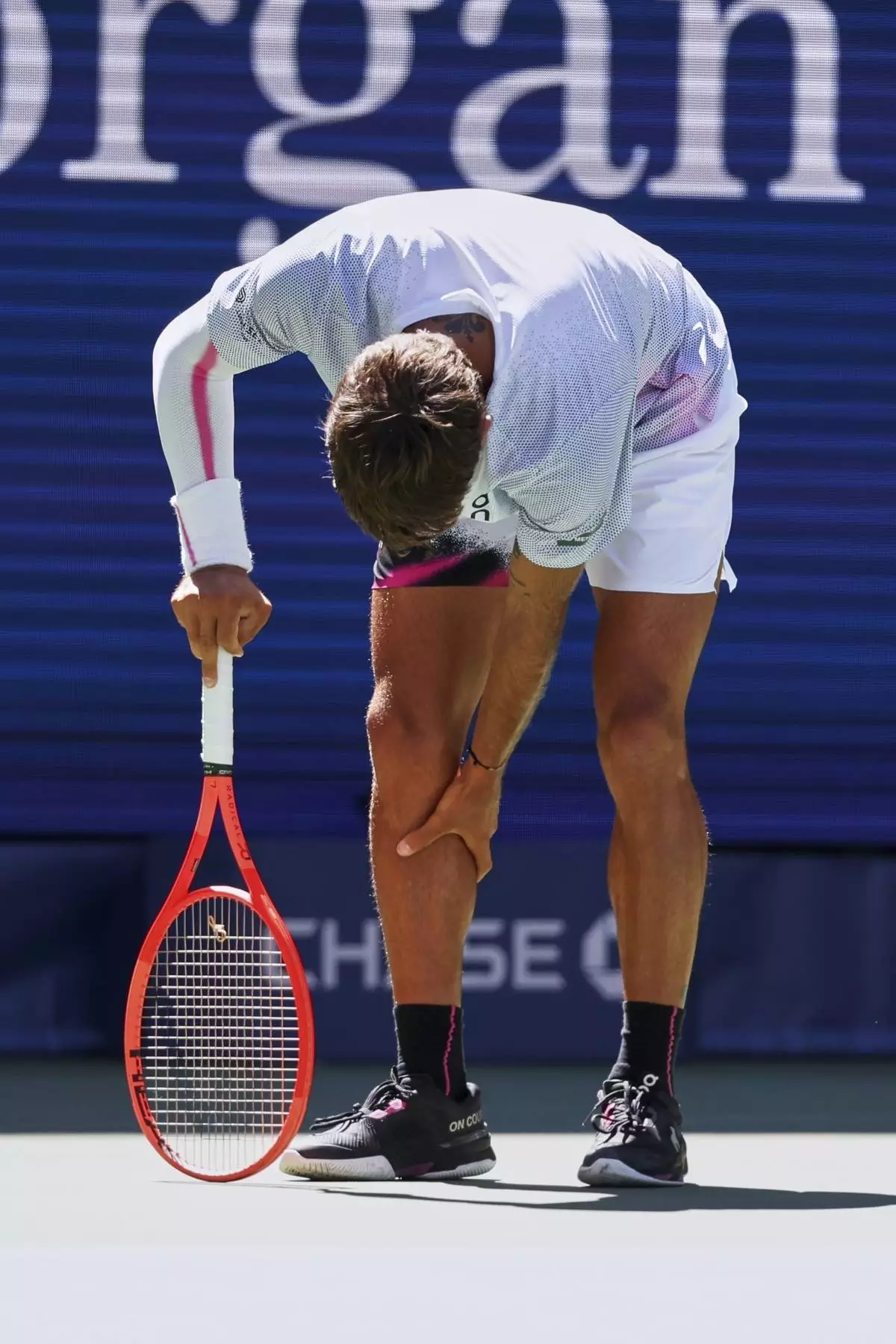 Flavio Cobolli, of Italy, holds his leg before retiring from the match against Lorenzo Musetti, of Italy, during the third round of the U.S. Open tennis championships, Saturday, Aug. 30, 2025, in New York. (AP Photo/Heather Khalifa)