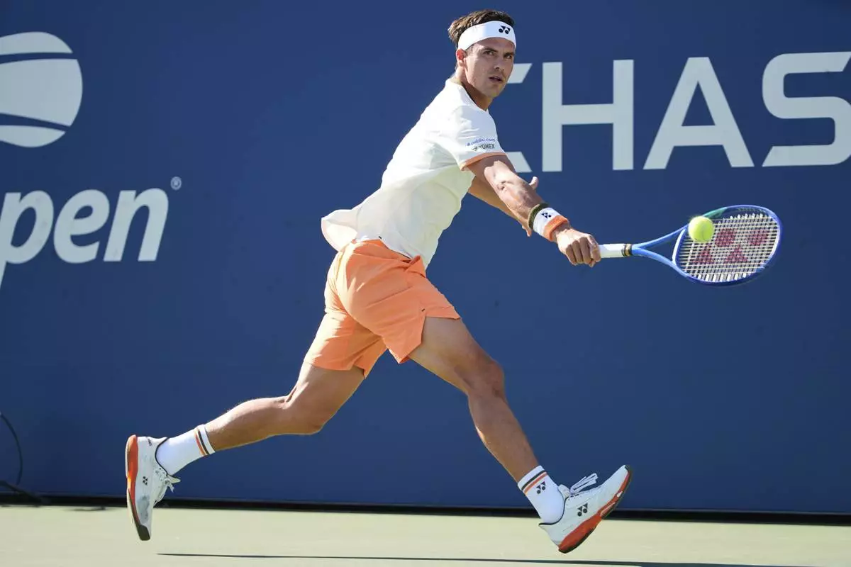 Daniel Altmaier, of Germany, returns a shot against Alex de Minaur, of Australia, during the third round of the U.S. Open tennis championships, Saturday, Aug. 30, 2025, in New York. (AP Photo/Pamela Smith)