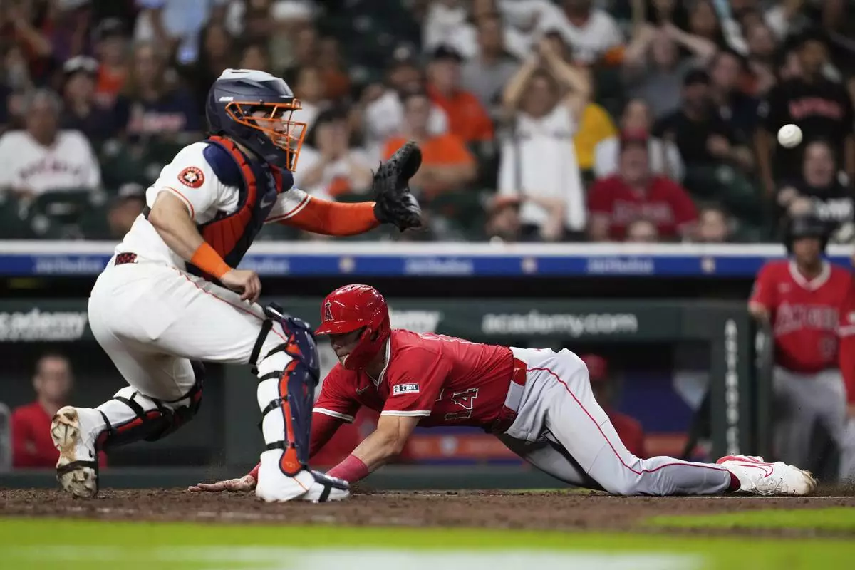 Los Angeles Angels' Logan O'Hoppe (14) scores ahead of a throw to Houston Astros catcher Yainer Diaz, left, during the ninth inning of a baseball game against the Houston Astros in Houston, Saturday, Aug. 30, 2025. (AP Photo/Ashley Landis)
