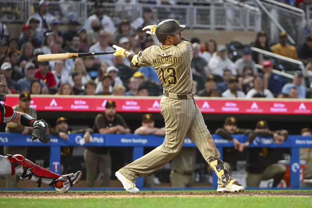 San Diego Padres' Manny Machado hits an RBI single off Minnesota Twins pitcher Mick Abel during the seventh inning of a baseball game Saturday, Aug. 30, 2025, in Minneapolis. (AP Photo/Craig Lassig)
