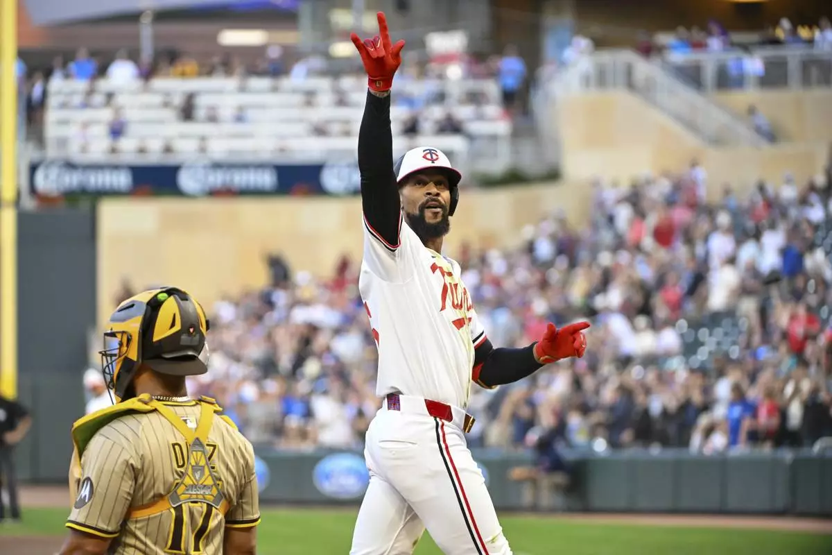 Minnesota Twins' Byron Buxton, right, gestures to the crowd as he walks past San Diego Padres catcher Elias Díaz, left, after hitting a two-run home run during the fifth inning of a baseball game Saturday, Aug. 30, 2025, in Minneapolis. (AP Photo/Craig Lassig)