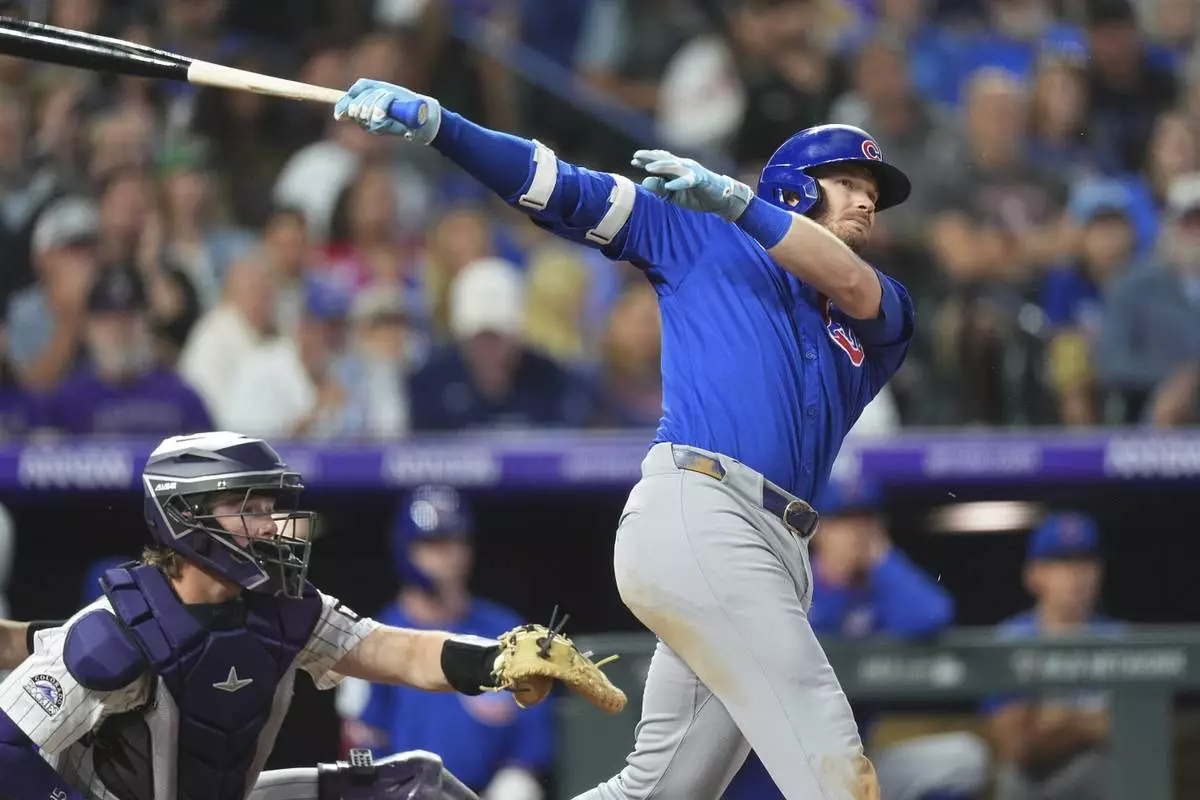Chicago Cubs' Ian Happ, right, follows the flight of his RBI double off Colorado Rockies starting pitcher McCade Brown in the fifth inning of a baseball game Saturday, Aug. 30, 2025, in Denver. (AP Photo/David Zalubowski)