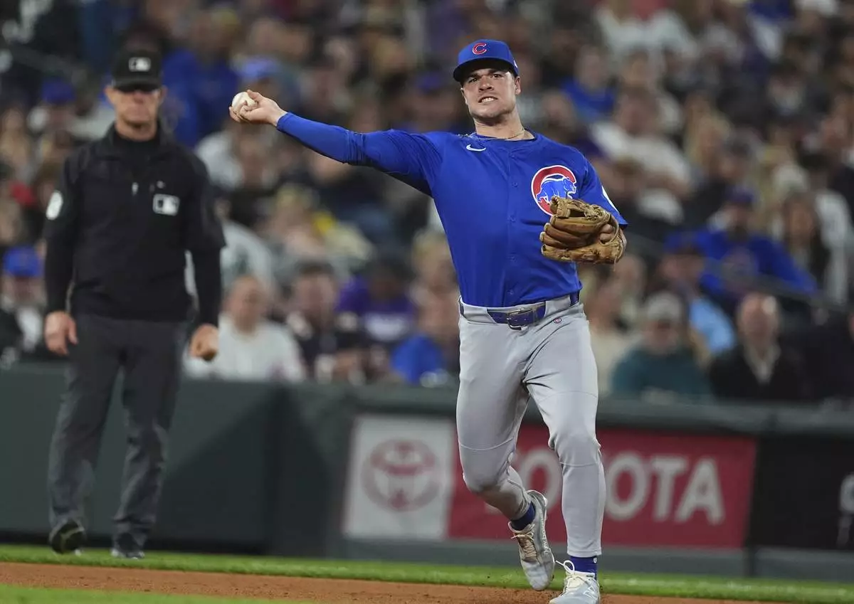 Chicago Cubs third baseman Matt Shaw throws to first base to put out Colorado Rockies' Hunter Goodman to end the eighth inning of a baseball game Saturday, Aug. 30, 2025, in Denver. (AP Photo/David Zalubowski)