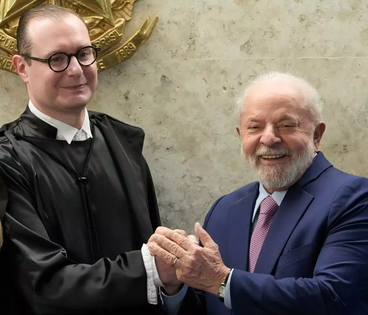 FILE - Brazil's President Luiz Inacio Lula da Silva, right, and new Supreme Court Justice Cristiano Zanin, pose for photos after his swearing-in ceremony, in Brasilia, Brazil, Aug. 3, 2023. (AP Photo/Eraldo Peres, File)