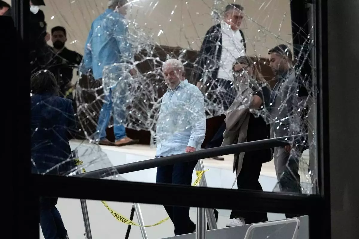 FILE - Brazil's President Luiz Inacio Lula da Silva surveys the damage at the Planalto Palace after it was stormed by supporters of former President Jair Bolsonaro, in Brasilia, Brazil, Jan. 8, 2023. (AP Photo/Eraldo Peres, File)