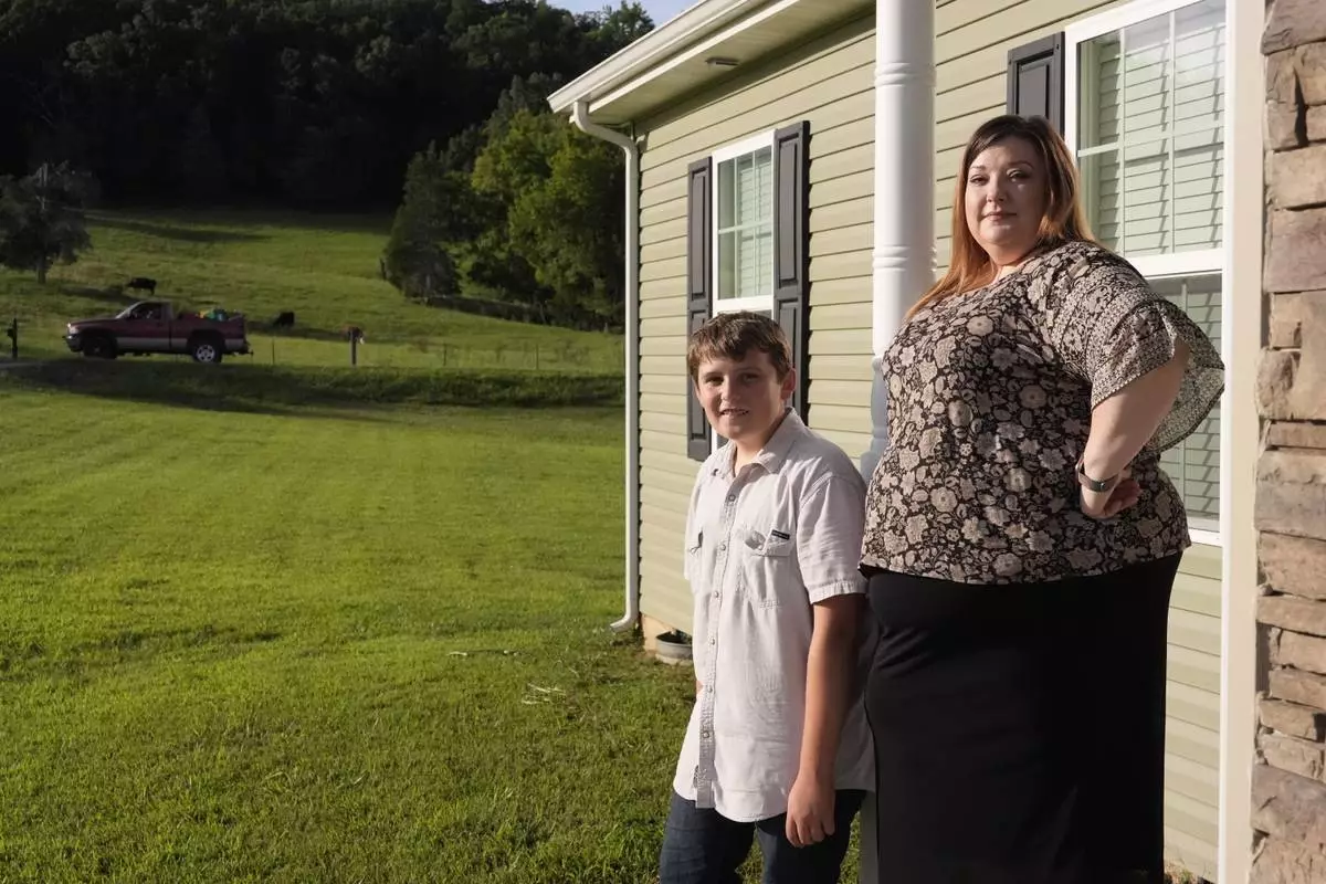 Heather Colley, right, poses with her son, Michah, outside their home Wednesday, Aug. 27, 2025, in Talbott, Tenn. (AP Photo/George Walker IV)