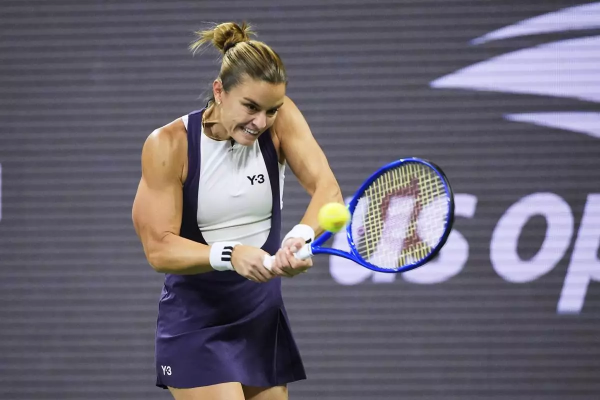 Maria Sakkari, of Greece, returns a shot against Beatriz Haddad Maia, of Brazil, during the third round of the U.S. Open tennis championships, Saturday, Aug. 30, 2025, in New York. (AP Photo/Pamela Smith)