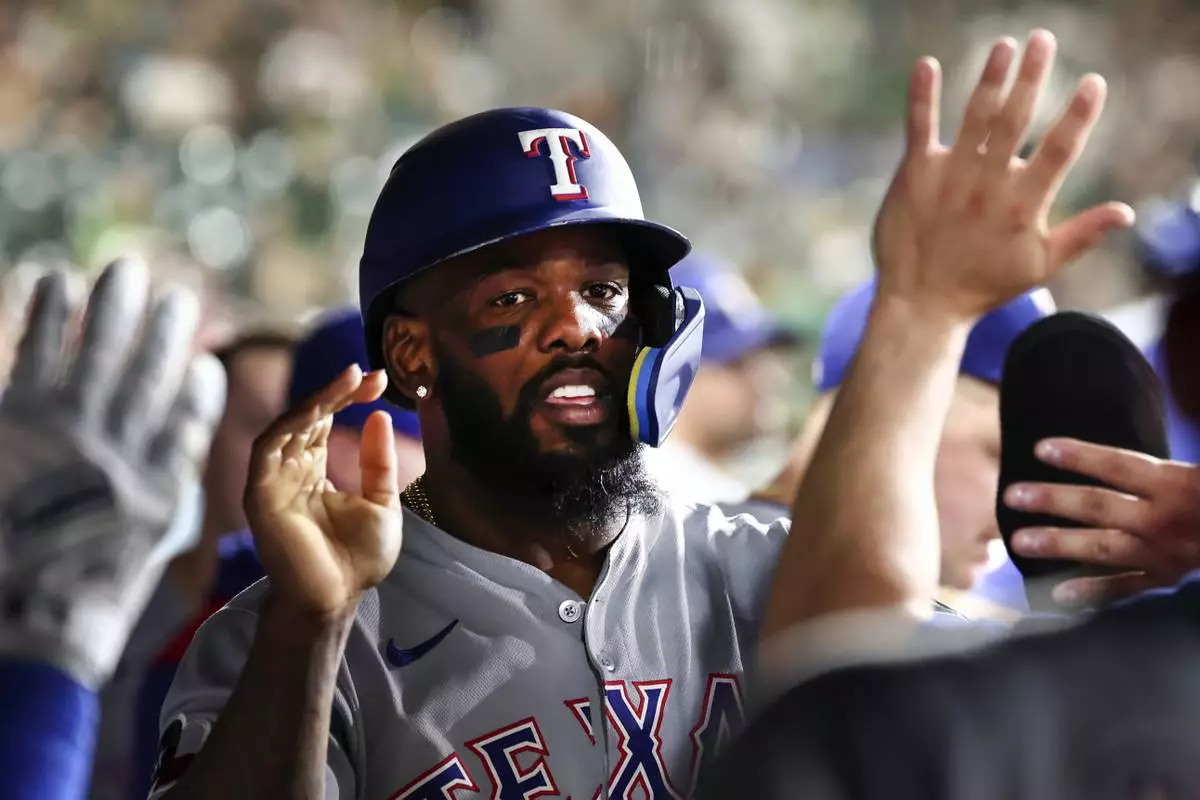 Texas Rangers' Adolis García celebrates in the dugout after scoring during the ninth inning of a baseball game against the Athletics Saturday, Aug. 30, 2025, in West Sacramento, Calif. (AP Photo/Sara Nevis)