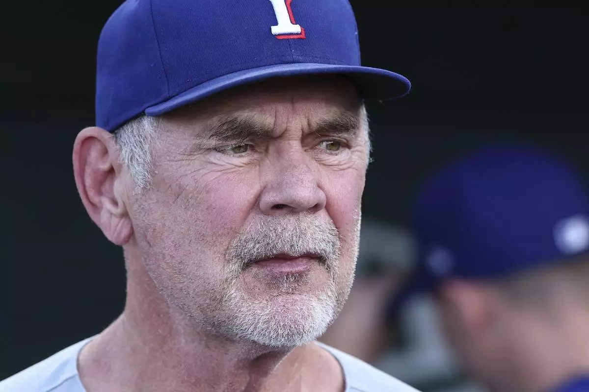Texas Rangers manager Bruce Bochy looks to the field before a baseball game against the Athletics Saturday, Aug. 30, 2025, in West Sacramento, Calif. (AP Photo/Sara Nevis)