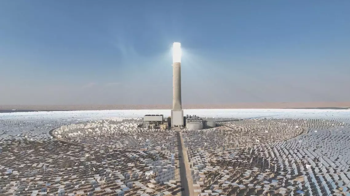 The project combines Concentrated Solar Power (CSP) and Photovoltaic (PV) technologies and features a 263-meter central tower surrounded by 70,000 heliostats that reflect and concentrate sunlight toward the receiver, creating a dazzling spectacle of beams across the desert.