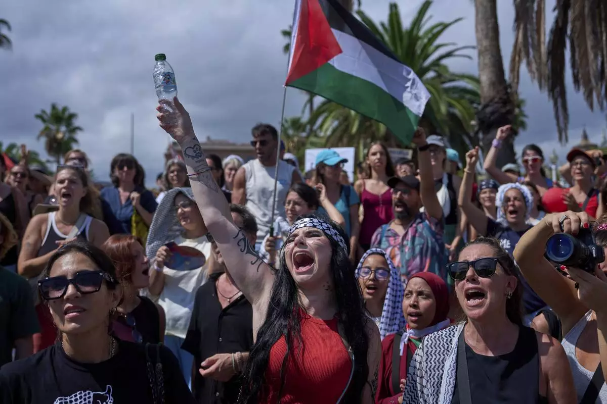 People shout slogans as they bid farewell to activists setting sail on their boats to join a civilian flotilla bound for Gaza, with the aim of breaking the Israeli blockade and delivering humanitarian aid, in Barcelona, Spain, on Sunday, August 31, 2025. (AP Photo/Emilio Morenatti)