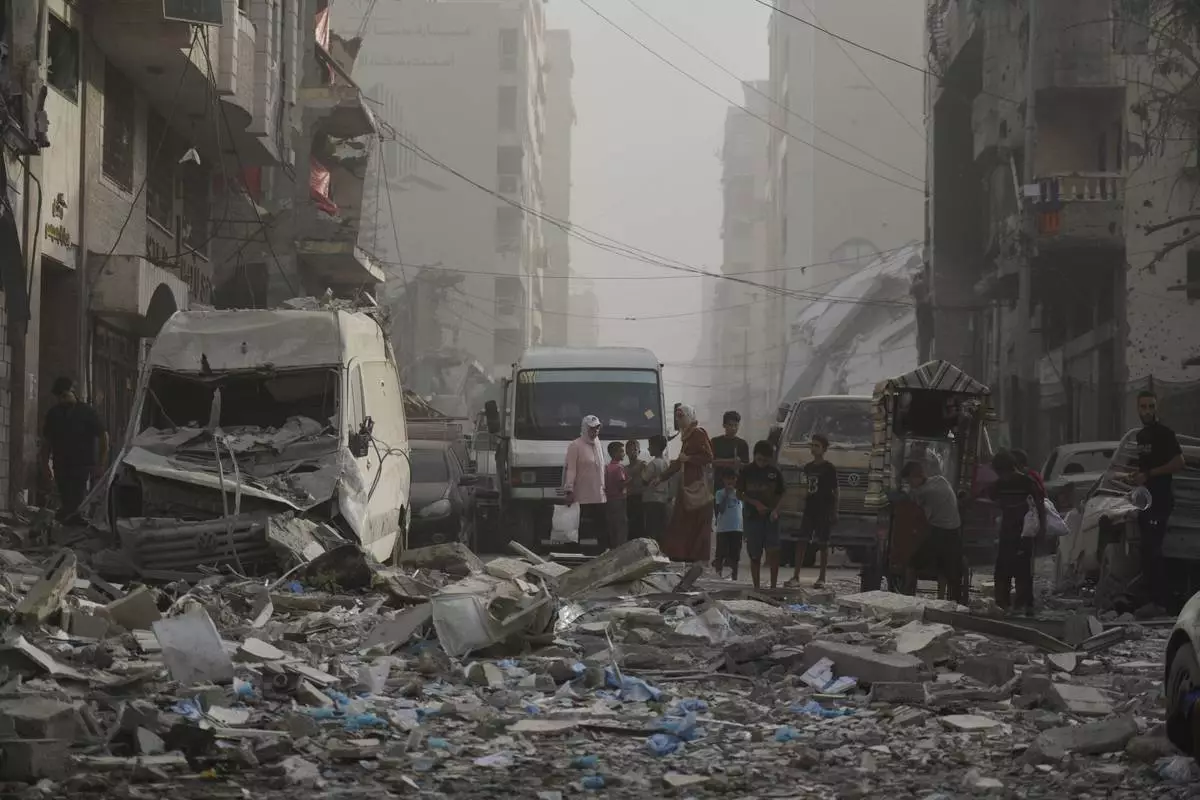 Palestinians stand next to a heavily damaged building in the Rimal neighborhood, in Gaza City, Sunday, Aug. 31, 2025, a day after it was hit by an Israeli military strike that killed several people. (AP Photo/Jehad Alshrafi)