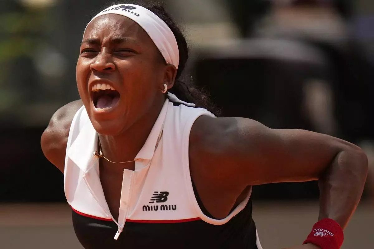 FILE - United States' Coco Gauff reacts as she plays Britain's Emma Raducanu during their tennis match at the Italian Open at the Foro Italico in Rome, May 12, 2025. (AP Photo/Alessandra Tarantino, File)