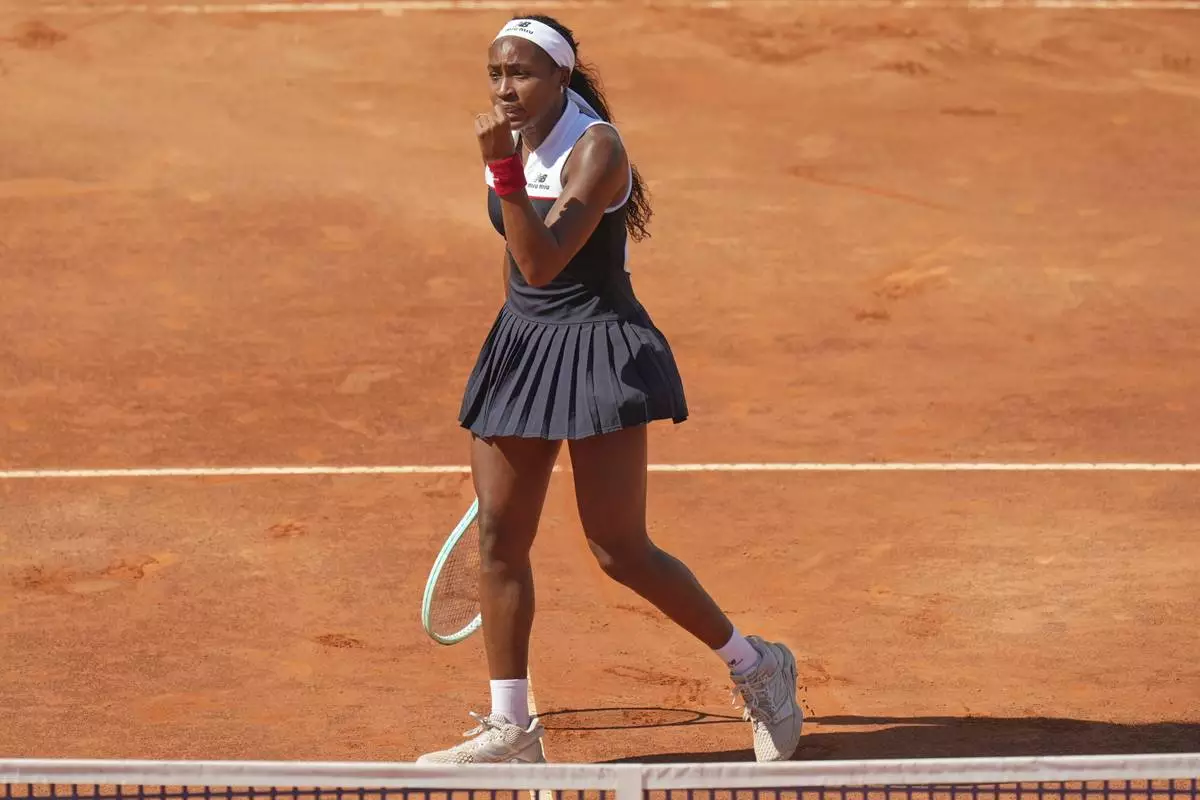 FILE - United States' Coco Gauff celebrates after defeating Mirra Andreeva in their tennis match at the Italian Open at the Foro Italico in Rome, May 14, 2025. (AP Photo/Alessandra Tarantino, File)