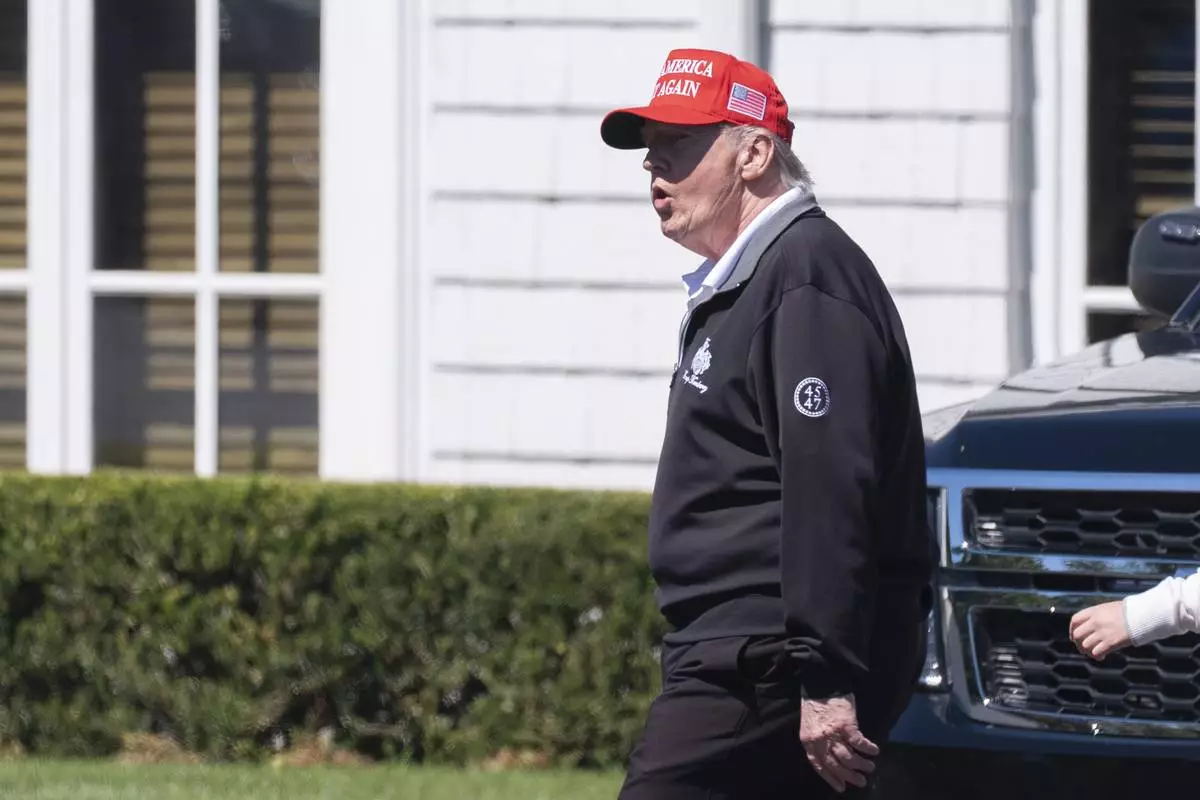 President Donald Trump walks at the Trump National Golf Club in Sterling, Va., Saturday, Aug. 30, 2025. (AP Photo/Manuel Balce Ceneta)