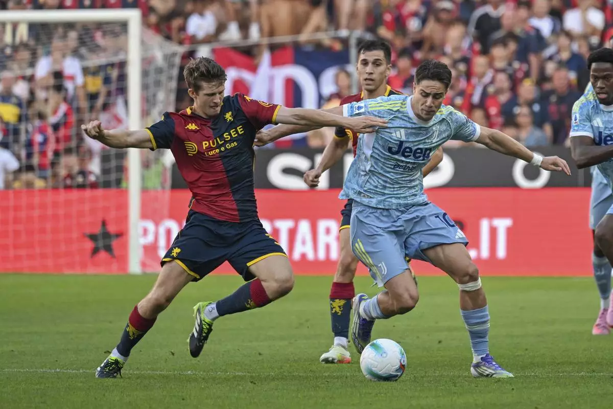 Genoa's Morten Frendrup, left, and Juventus' Kenan Yildiz, right, challenge for the ball during the Serie A soccer match between CFC Genoa 1893 and Juventus Turin in Genoa, Italy, Sunday, Aug. 31, 2025. (Tano Pecoraro/LaPresse via AP)