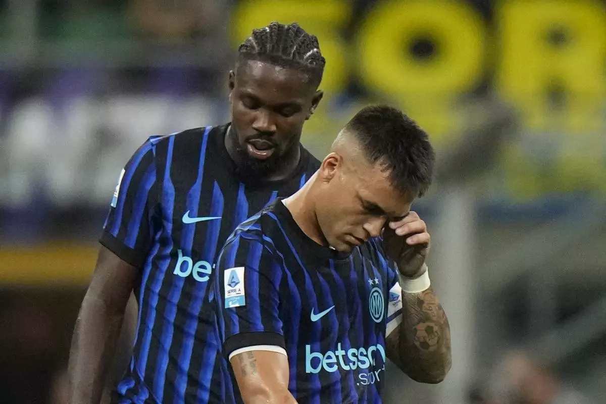 Inter Milan's Lautaro Martinez and his teammate Marcus Thuram react after Udinese's Arthur Atta scored his side's second goal during a Serie A soccer match between Inter Milan and Udinese at the San Siro stadium in Milan, Italy, Sunday, Aug.31, 2025. (AP Photo/Luca Bruno)