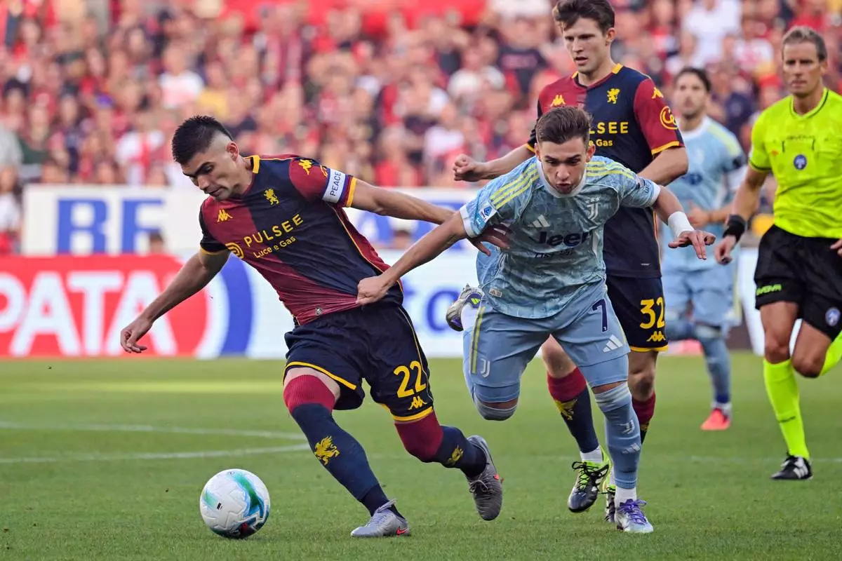 Genoa's Johan Vasquez, left, and Juventus' Francisco Conceicao, right, challenge for the ball during the Serie A soccer match between CFC Genoa 1893 and Juventus Turin in Genoa, Italy, Sunday, Aug. 31, 2025. (Tano Pecoraro/LaPresse via AP)