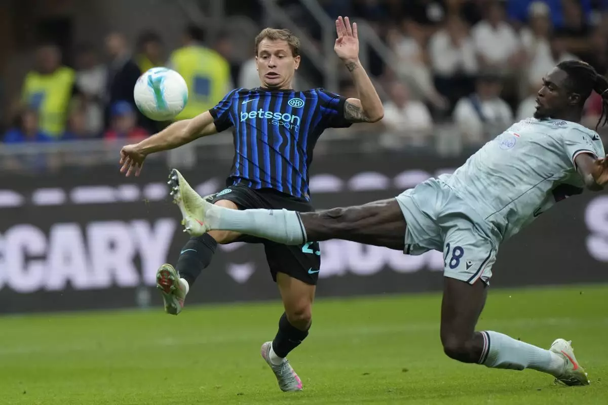 Inter Milan's Nicolo Barella challenges for the ball with Udinese's Adam Buksa during a Serie A soccer match between Inter Milan and Udinese at the San Siro stadium in Milan, Italy, Sunday, Aug.31, 2025. (AP Photo/Luca Bruno)