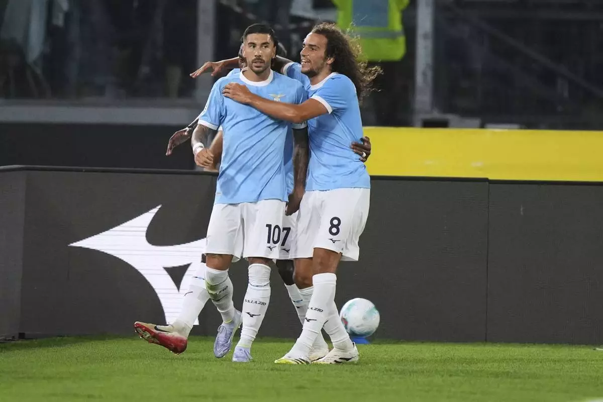 Lazio's Mattia Zaccagni, left, celebrates with his teammates after he scored his side's second goal during a Serie A soccer match between Lazio and Hellas Verona, at Rome's Olympic Stadium, Sunday, Aug. 31, 2025. (AP Photo/Andrew Medichini)