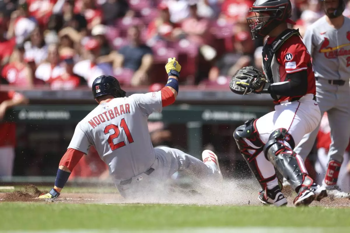 St. Louis Cardinals' Lars Nootbaar (21) slides home on a sacrifice fly by Nolan Gorman in the first inning against the Cincinnati Reds, Sunday, Aug. 31, 2025, in Cincinnati. (AP Photo/Abdoul Sow)