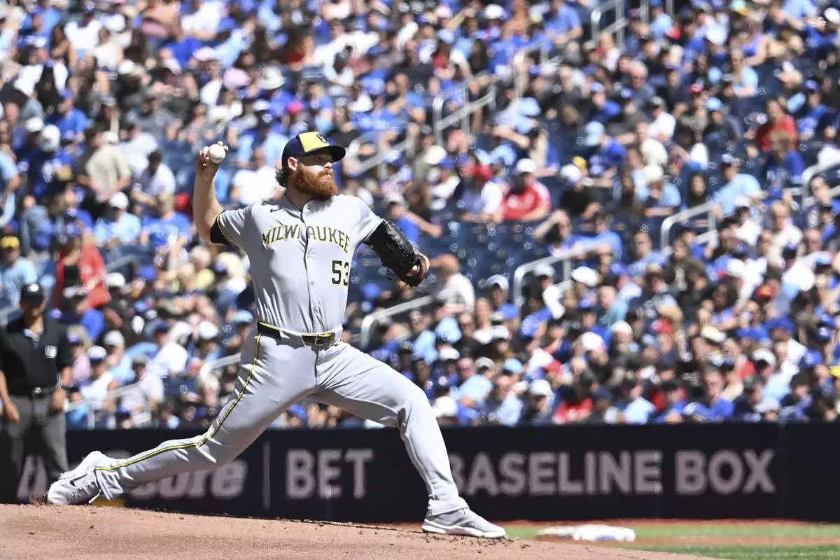Milwaukee Brewers starting pitcher Brandon Woodruff (53) throws to a Toronto Blue Jays batter during the first inning of a baseball game in Toronto on Sunday, Aug. 31, 2025. (Jon Blacker/The Canadian Press via AP)
