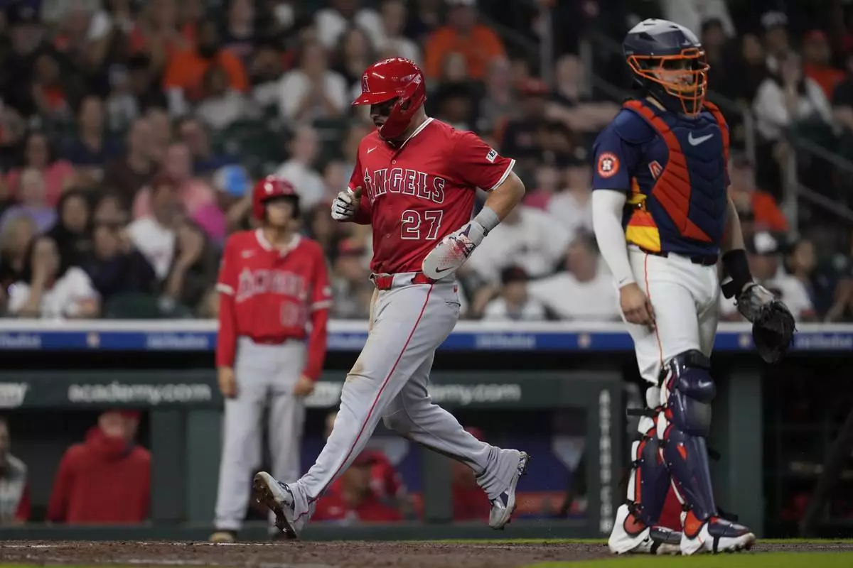 Los Angeles Angels designated hitter Mike Trout (27) scores off of a single hit by Luis Rengifo during the eighth inning of a baseball game against the Houston Astros in Houston, Sunday, Aug. 31, 2025. (AP Photo/Ashley Landis)