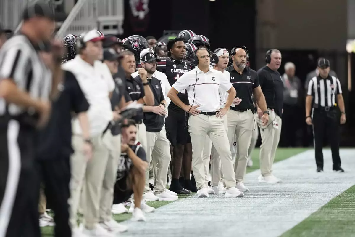 South Carolina head coach Shane Beamer on the sideline during an NCAA college football game against Virginia Tech, Sunday, Aug. 31, 2025, in Atlanta. (AP Photo/Brynn Anderson)