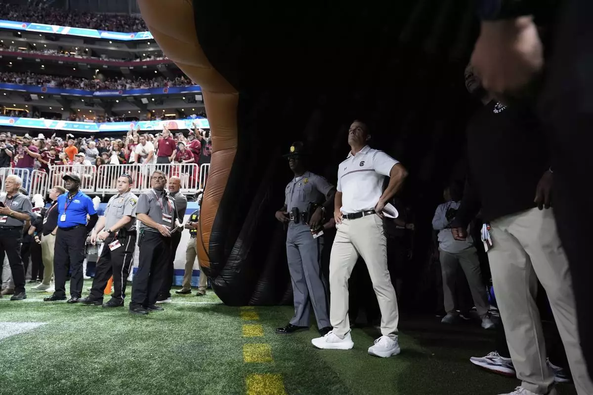 South Carolina head coach Shane Beamer looks out to the crowd before an NCAA college football game against Virginia Tech, Sunday, Aug. 31, 2025, in Atlanta. (AP Photo/Brynn Anderson)