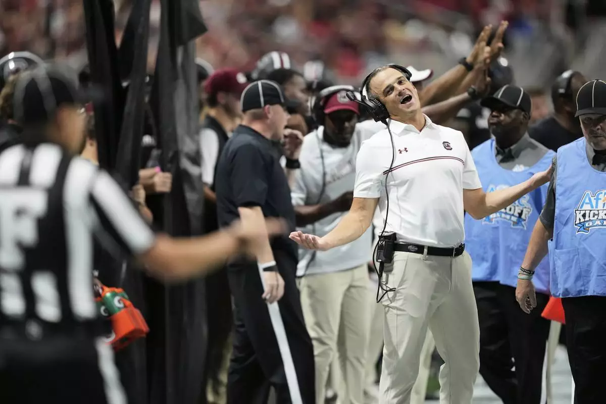 South Carolina head coach Shane Beamer reacts on the sideline during an NCAA college football game against Virginia Tech, Sunday, Aug. 31, 2025, in Atlanta. (AP Photo/Brynn Anderson)